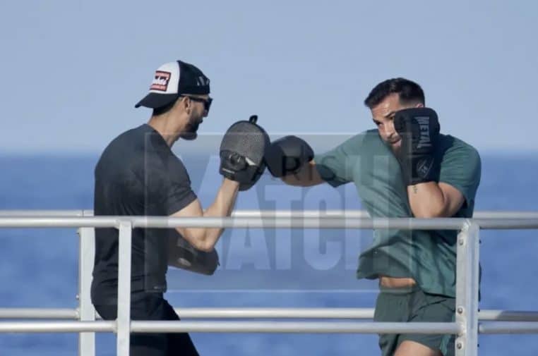 « Il fait de la course à pied, de la corde à sauter ainsi que des séances de boxe avec son coach, le tout sous le regard bienveillant d’Alban, l’un de ses deux managers » est-il écrit.