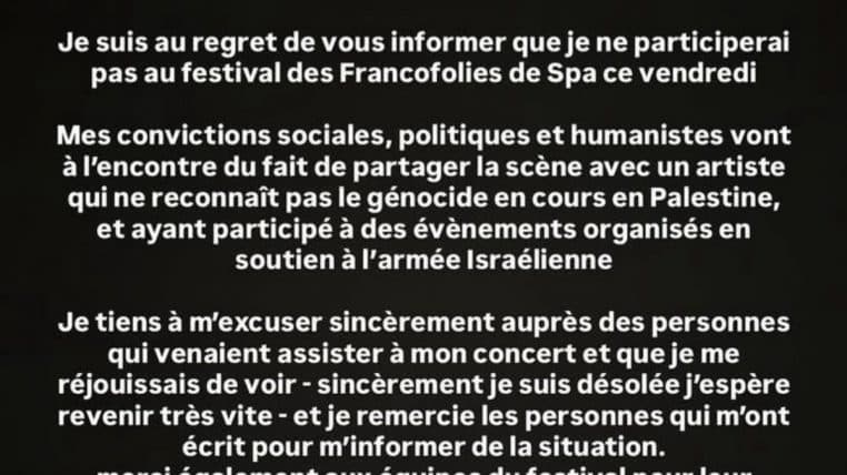 Comme l’indique l’image ci-dessus, la chanteuse franco-suisse a été encore plus loin. Et pour cause, elle a décidé d’annuler sa venue au festival belge. « Mes convictions sociales, politiques et humanistes vont à l’encontre du fait de partager la scène avec un artiste qui ne reconnaît pas le génocide en cours en Palestine, et ayant participé à des événements organisés en soutien à l’armée israélienne »