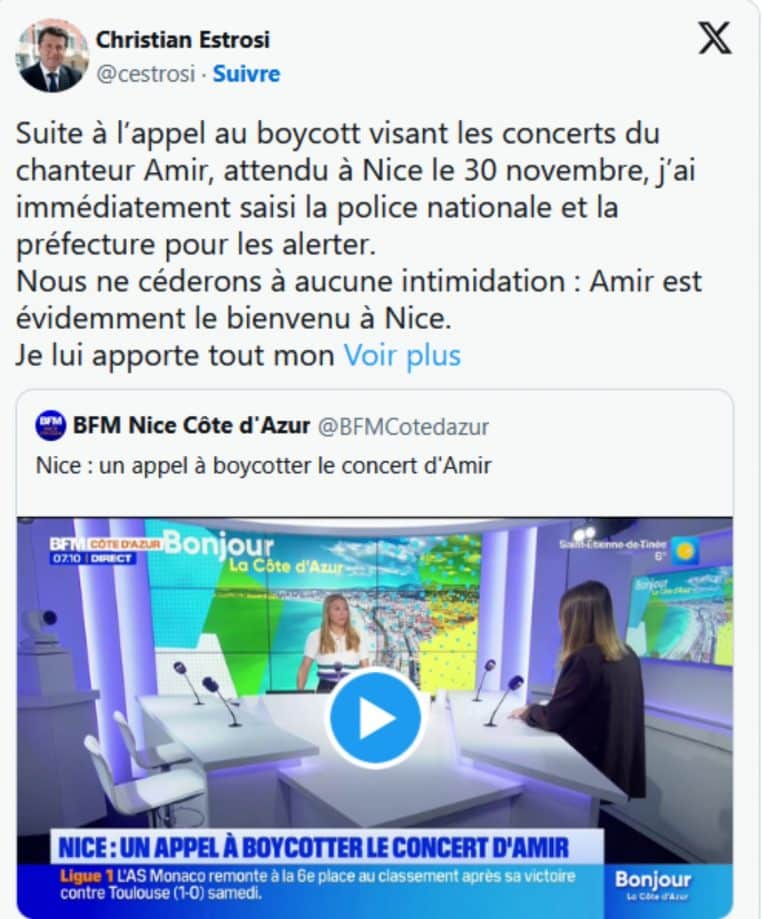 Dans son malheur, le chanteur a pu compter sur le soutien du maire de la ville de Nice, Christian Estrosi. Sur son compte Twitter, ce dernier a déclaré avoir « immédiatement saisi la police nationale et la préfecture ». Aux yeux du mari Laura Tenoudj, son devoir d’élu de la République est de se mobiliser contre les « attaques injustifiables dont Amir est victime.»
