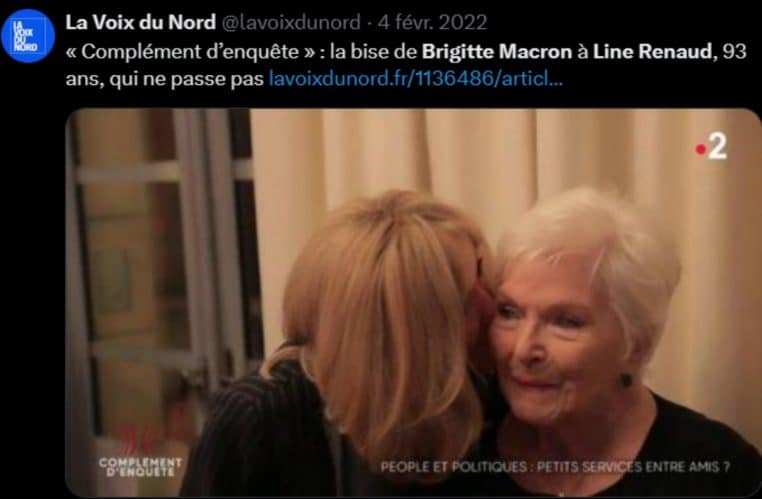 Telles que l’atteste cette accolade, Line Renaud et Brigitte Macron sont vraiment proches et complices. « L’ex-professeure a su instantanément toucher Line au cœur en évoquant les Hauts-de-France, région de leurs communes racines. […] Les deux femmes aiment aller au théâtre ensemble. Et rigoler à gorge déployée. »