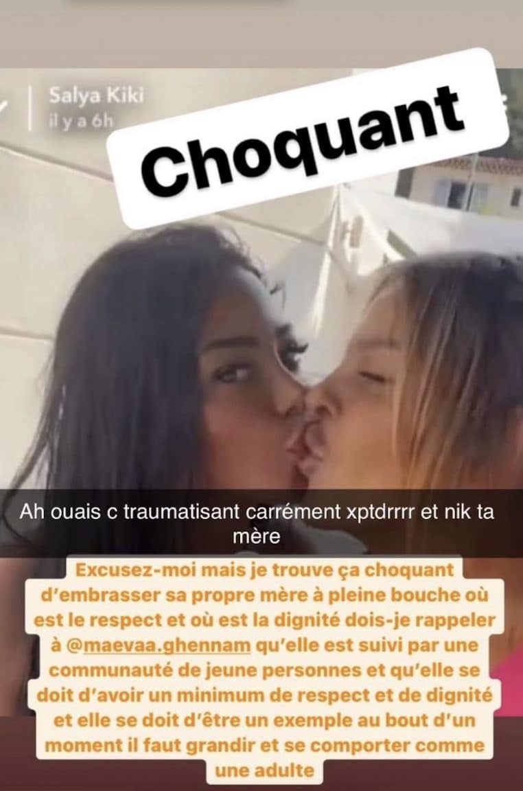 Salya et Maeva Ghennam sont si complices qu’elles échangent des baisers sur la bouche. La blogueuse Solife-Gossip, suivie par plus de 80.000 abonnés sur Instagram, s’est empressée de reposter la photo. Indignée, elle commente : « je trouve ça choquant d’embrasser sa propre mère à pleine bouche » .