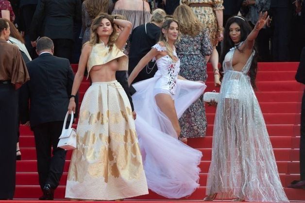 Mais lors de la montée des marches, cet accoutrement si particulièrement s’est fait éclipser par celui d’une influenceuse. Et pour cause, une jeune mannequin qui montait les marches a sur-estimé la taille de ton top. Elle a levé les bras en haut des marches, se retrouvant alors seins nus devant toute la foule !