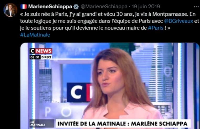 Au début du second millénaire, Marlène Schiappa se présente aux élections municipales « sur une liste associative de gauche à Paris« . À l’époque, elle vient de décrocher son baccalauréat section ES. Aussi, elle rêve de changer le quotidien des gens de son quartier « Montparnasse-Gaieté-Pernety«