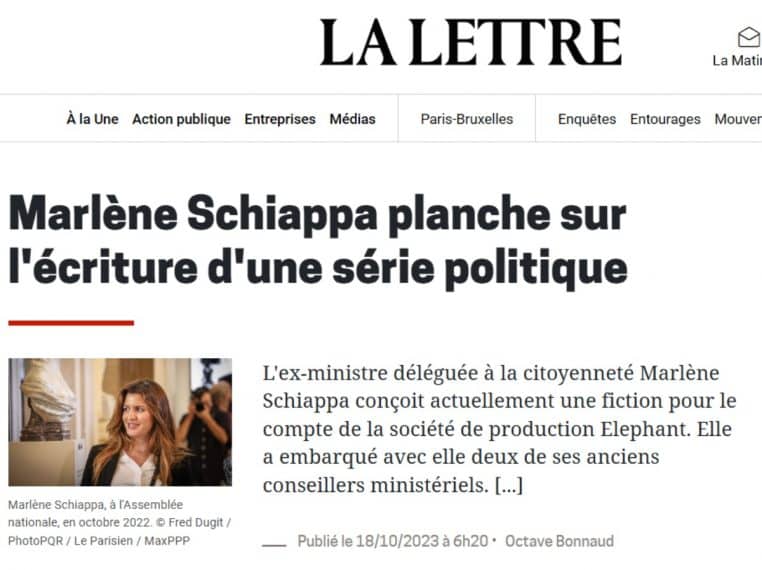 Cette publication de « La lettre de l’Audiovisuel » amuse les admirateurs de Marlène Schiappa. Dans cet article, notre confrère révèle son retour à la case écriture. Non, ce n’est pas un énième panflet politique ou roman pour adultes. A l’instar d’Edouard Philippe et le feuilleton « Dans l’ombre », elle voit la petite lucarne comme un atout. Promis, on vous tient au courant !