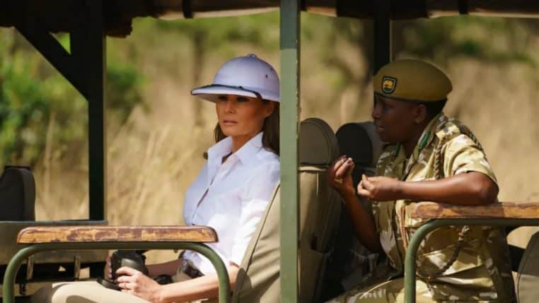 Moins d’un an après l’élection de son mari, elle décide d’aller à la rencontrer du peuple africain. Or, une fois sur place, tout va basculer. Et pour cause, sa tenue vestimentaire, et surtout ce fameux couvre-chef, créer un tsunami médiatique. De l’avis d’un spécialiste, ces cinq jours ont les ingrédients du « tiercé perdant: des éléphants, des orphelins et un casque colonial.»