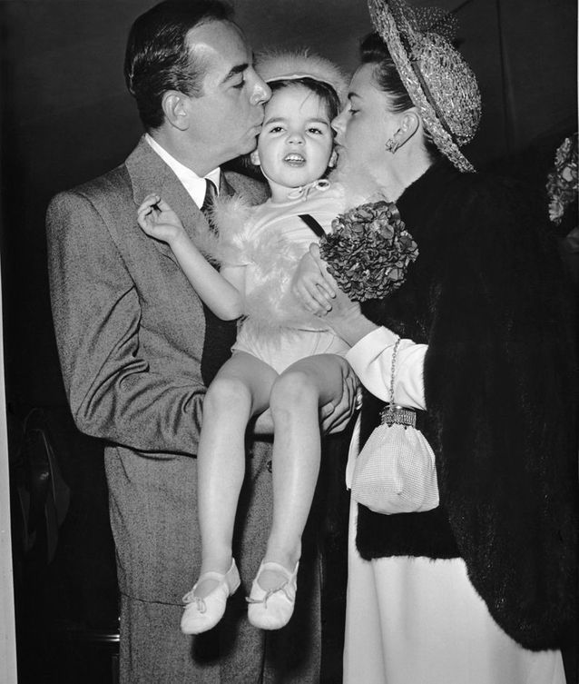 Un baiser groupé pour la famille pour la jeune Liza Minnelli, entourée de ses parents Judy Garland et Vincente Minnelli en 1947