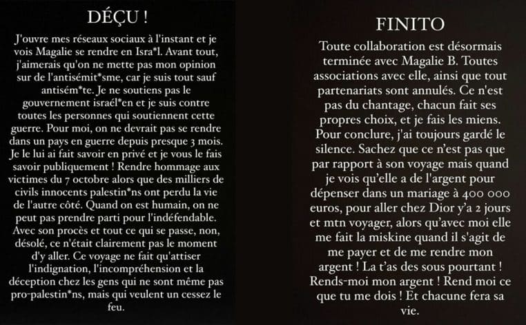 Après avoir collaboré pendant plusieurs années avec Magali Berdah, Milla Jasmine a pris son téléphone portable ce dimanche 10 décembre pour régler ses comptes : « Déçue. J’ouvre mes réseaux sociaux et je vois Magali se rendre en Israël. Avant tout, j’aimerais qu’on ne mette pas mon opinion sur l’antisémitisme, car je suis tout sauf antisémite ! », a-t-elle déclaré, avant de poursuivre : « Avec son procès et tout ce qui se passe, non, désolé, ce n’était clairement pas le moment d’y aller. Ce voyage ne fait qu’attiser l’indignation, l’incompréhension et la déception chez les gens qui ne sont même pas pro-palestiniens, mais qui veulent un cessez-le-feu ».