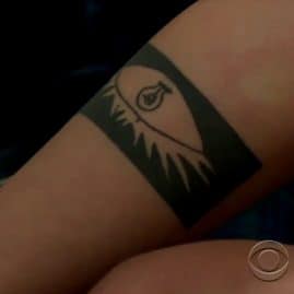 Ce tatouage enfantin fait parler de lui. On peut y voir une sorte d’oeil graphique dans un rectangle noir. À première vue, ce tatouage semble avoir été réalisé par un enfant, avec des gros traits et peu de détails. Mais, le style de ce graphique faussement grossier est dingue. De loin comme de près, il est magnifique.