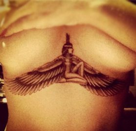 La chanteuse Rihanna possède un tatouage sous les seins. On peut voir un(e) pharaon ailé d’une précision et d’une beauté sans commune mesure.