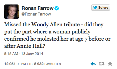 Le jeune homme de 26 ans n’a pas hésité a publié un tweet assez provoc et choc sur son père : « J’ai raté l’hommage à Woody Allen. Ont-ils mentionné le moment où une femme a confirmé publiquement avoir été agressée par lui alors qu’elle n’avait que 7 ans avant ou après Annie Hall ? ». Bien évidemment, Mia Farrow (l’ex campagne de Woody) s’est empressée de retweeter ce tweet qui concerne en réalité sa fille adoptive Dylan.