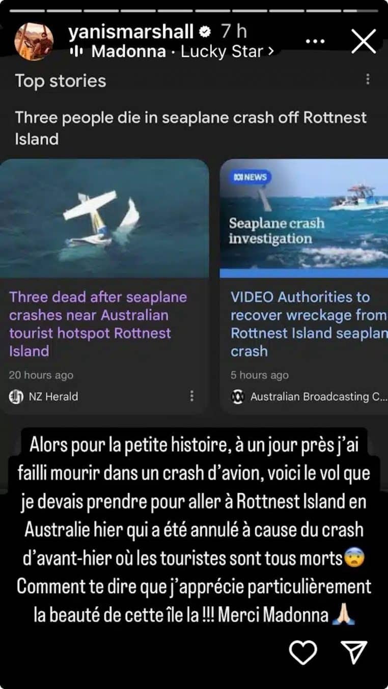 En effet, Yanis Marshall a confié à ses abonnés qu’il avait échappé de justesse à un crash d’avion. « À un jour près, j’ai failli mourir dans un crash, » a-t-il expliqué.
