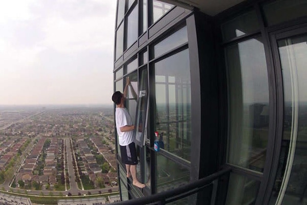 Qu’il s’agisse de rouler à moto avec un seau en guise de casque, de nettoyer les vitres d’un building debout sur la fenêtre sans aucune protection, voire même de couper la branche sur laquelle il est assis, il semblerait que l’homme dans son entièreté soit assez téméraire… suffisamment en tout cas pour mettre sa vie en danger sans jamais sourciller !