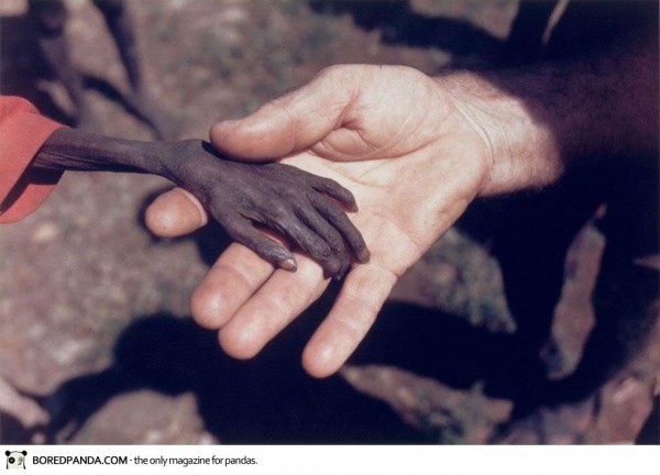 1) Avril 1980, Karamoj, Ouganda : Un missionnaire prend la main d’un enfant mourant de famine.