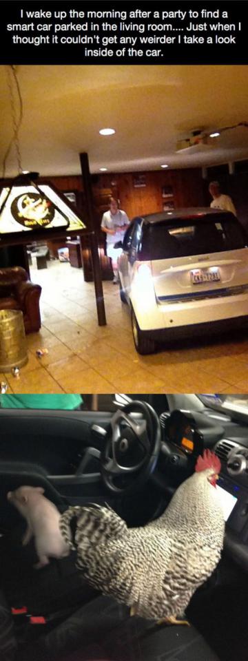 Donc cette personne s’est réveillée après une soirée, a trouvé une Smart dans son salon, à l’intérieur de laquelle il y avait une poule et un cochon… TOUT va bien !