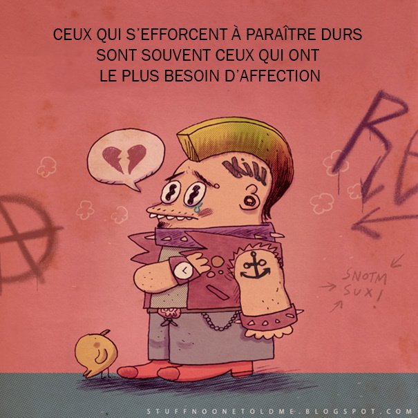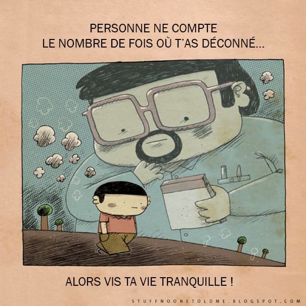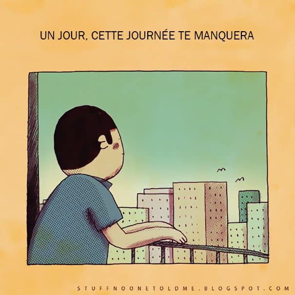 Il a donc réalisé une BD qui s’appelle « Stuff No One Told Me » qui est un condensé de ses petites illustrations sympas. Elles nous donnent une belle leçon de vie et nous crient une seule chose au visage : « Be Happy ! ». On espère vous redonner un peu le sourire en ce week-end pluvieux et morne.