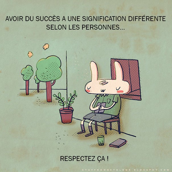 L’illustrateur explique qu’il souhaitait mettre sur papier toutes ces choses car il déprimait et avait besoin de mettre en forme ses échecs personnels en les couchant sur papier. Une chouette façon d’en faire profiter les personnes qui, comme lui, ont tendance à ressasser leurs idées noires.