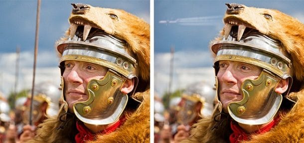 À cause d’un anachronisme qui s’est glissé lors du tournage de ce film d’époque, l’équipe de retouchage a eu un peu la main lourde. Il y a donc trois différences entre ces deux images.