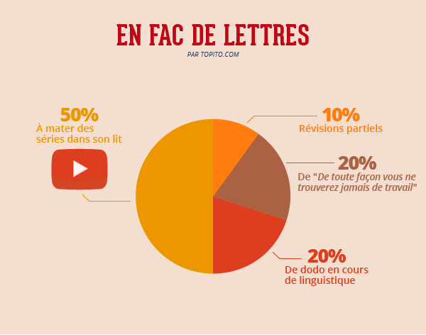 La formidable équipe du site TOPITO a réalisé une série d’infographies hilarantes qui nous dévoilent les véritables emplois du temps des étudiants selon leurs filières. Vous allez voir que finalement, être étudiant c’est plutôt la belle vie ! Mais ça on s’en rend souvent compte lorsqu’on a un patron sur le dos tous les jours…