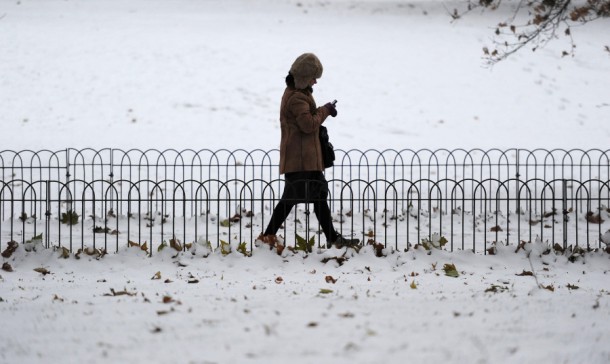 Une femme marche dans la neige à St James Park en 2010 (il neige? et alors? j’envoie un texto là!)