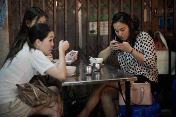 Un groupe de femmes partagent un repas, 2013 (mon téléphone est bien plus intéressant que mes deux copines!)
