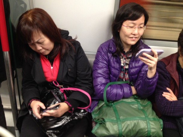 Passagers dans le métro, 2014 (On joue sur son téléphone pour passer le temps, c’est plus rigolo)