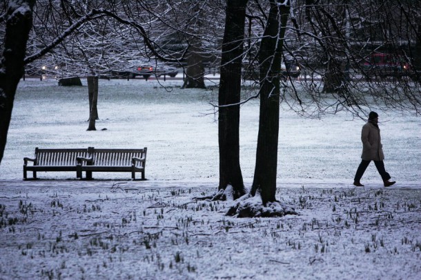 Un homme marche dans la neige à St James Park en 2007 (Que ce parc est beau quand il est enneigé!)