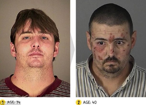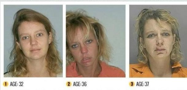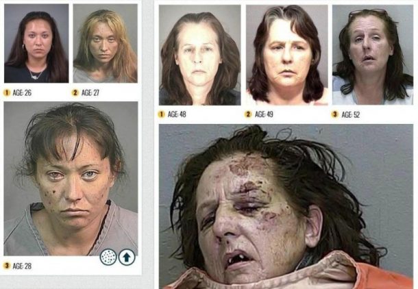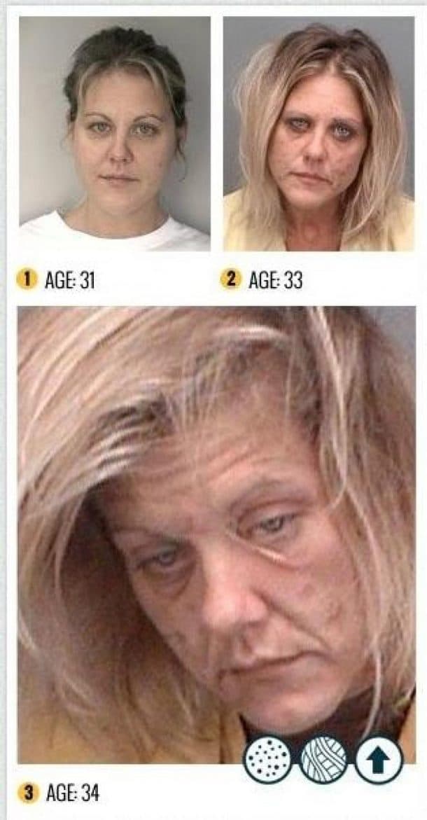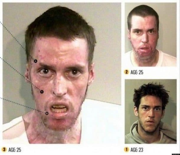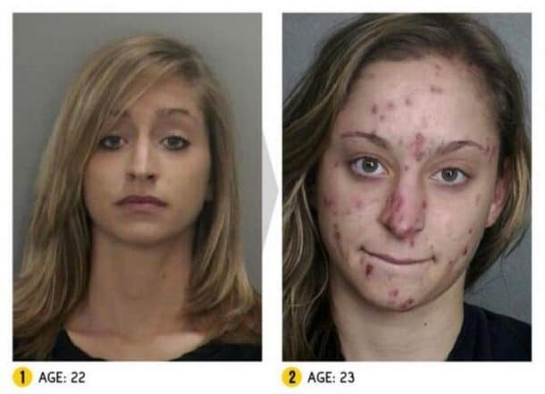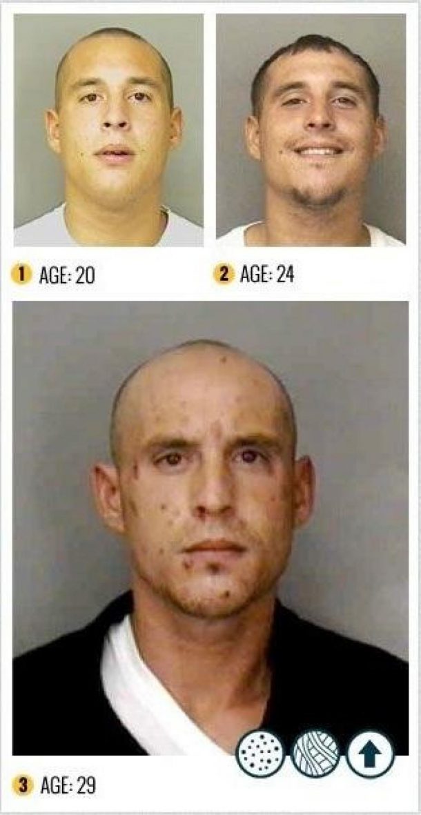 Ces photos devraient définitivement dissuader quiconque d’essayer des substances qui peuvent transformer le visage à jamais. En seulement, un, deux ou trois ans de temps, ces hommes et ces femmes se sont transformés en zombie. Outre leur attitude totalement apathique, ils ont perdu leurs dents, ont la peau remplie de boutons et de croutes.