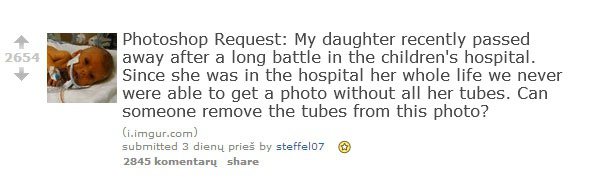 Un père désespéré par la mort de sa fille a voulu garder une bonne image d’elle autrement qu’entouré de tout un appareillage médical, qui lui rappelait de mauvais souvenirs… Il décida par conséquent de faire appel à des utilisateurs de Photoshop afin d’enlever les « tubes » médicaux l’aidant à respirer sur la seule photo qu’il avait d’elle. Le résultat est juste surprenant !