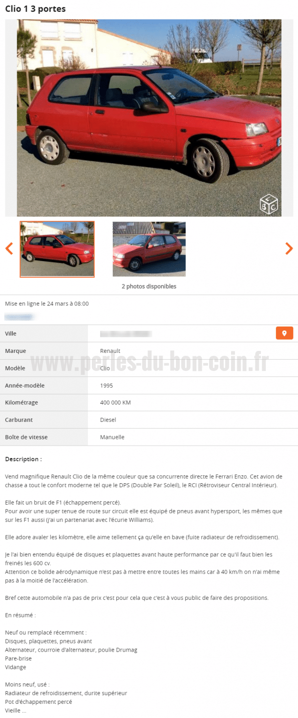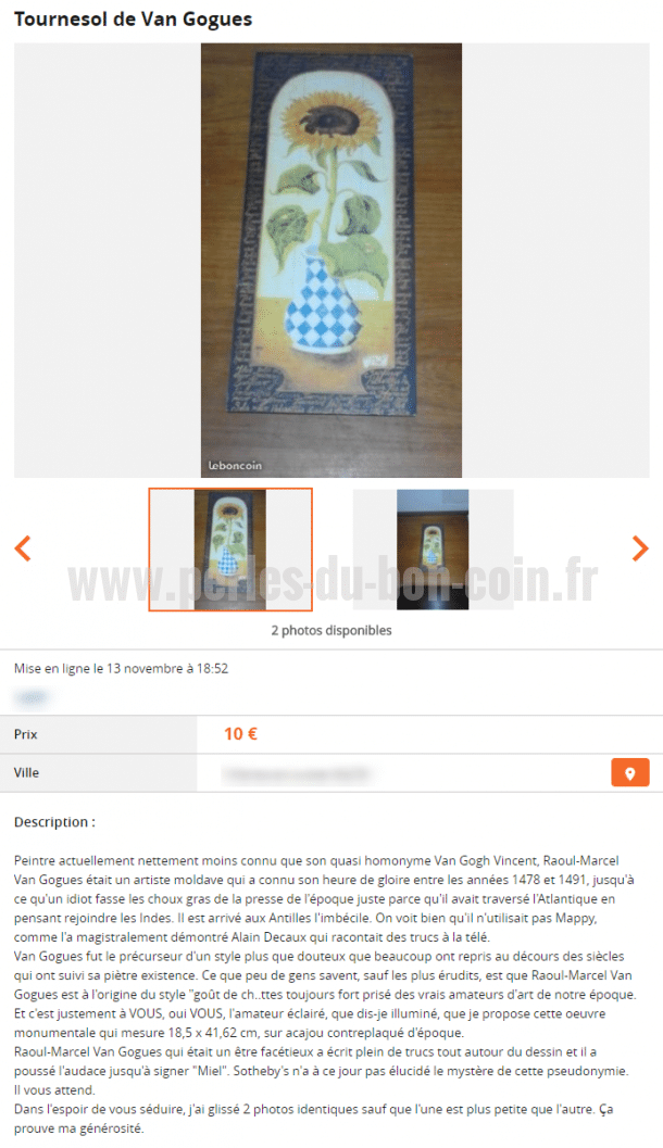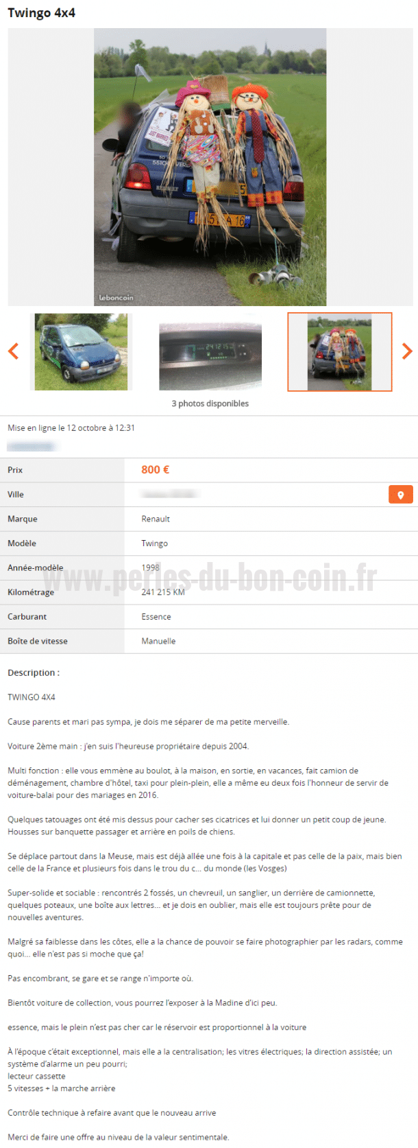 TDN > Photos Top 100 des pires annonces vues sur Le Bon Coin ! Publié par Elsa Fanjul le 13 Jan 2024 à 16:28 Suivez nous sur Google News Partagez cet article Veuillez laisser ce champ videRejoignez nos 875 726 abonnés en recevant notre newsletter gratuite N'oubliez pas de cliquer sur l'email de validation pour confirmer votre adresse email. Si vous ne l'avez pas recu vérifiez dans vos spams. Dernière étape pour confirmer votre inscription : il faut cliquer l'email de confirmation. Vérifiez dans vos spams si vous ne l'avez pas reçu ! A bientôt ! Page précédente Page suivante Laissez un commentaire Votre adresse e-mail ne sera pas publiée. Les champs obligatoires sont indiqués avec * Votre commentaire * Votre pseudo * Votre adresse e-mail * Cliquez ici pour commenter