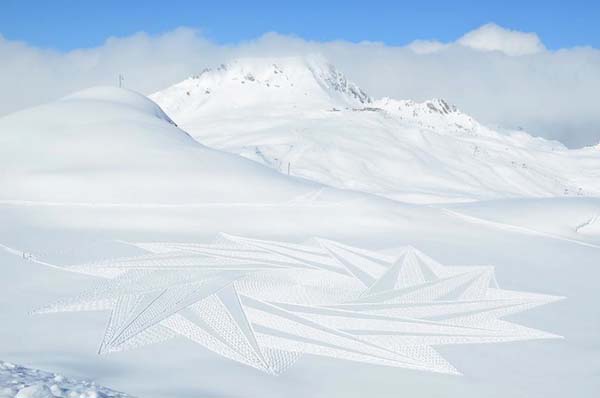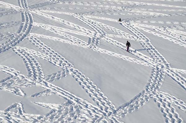 En effet, il crée de l’art simplement en marchant dans la neige et vous allez le voir, le résultat est superbe. La patience est de mise pour cet artiste…mais le résultat est là !!