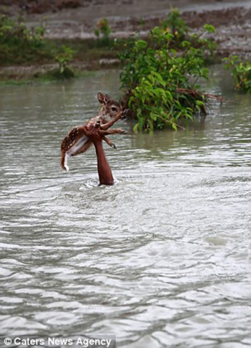 Tout en maintenant le faon hors de l’eau, Belal a commencé à remonter la rivière afin de regagner le bord. Plusieurs témoins ont assisté à la scène et beaucoup craignaient que Belal ne parvienne pas à rejoindre la terre ferme…