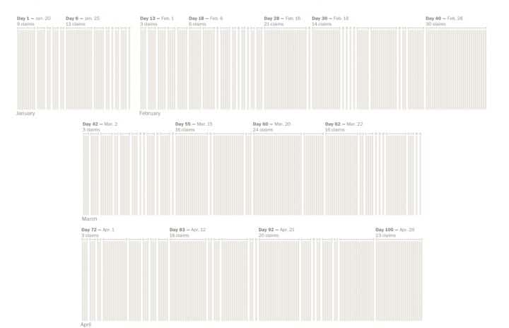 Représentation visuelle des fake-news prononcées par Donald Trump pendant les 100 premiers jours de son mandat. Crédits : The Washington Post.