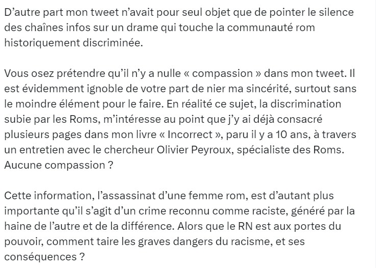 Mais ce tweet, il ne passe pas du tout. Alors qu’Alexis Corbière a dû rétablir la vérité face à un montage vidéo de lui, Aymeric Caron peine à se défendre face aux nombreuses personnalités qui ont pris part au débat. De quoi l’accuse-t-on ? Le député sortant LFI pourrait ne pas vouloir parler du viol d’une petite fille de 12 ans, de confession juive, par trois adolescents. « A.Caron est tellement incapable de dénoncer le viol de cette petite de 12 ans par des ados antisémites qu’il va rechercher dans Ouest France du 22 février dernier cet horrible crime » a indiqué Anne Sinclair sur X.
