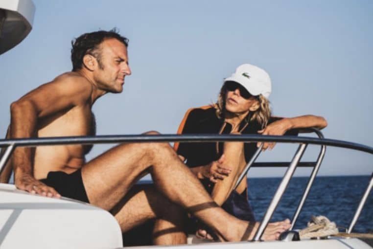 On y voit le président sur une planche en regardant à l’horizon, mais aussi le chef de l’État accompagné de sa femme sur un bateau.