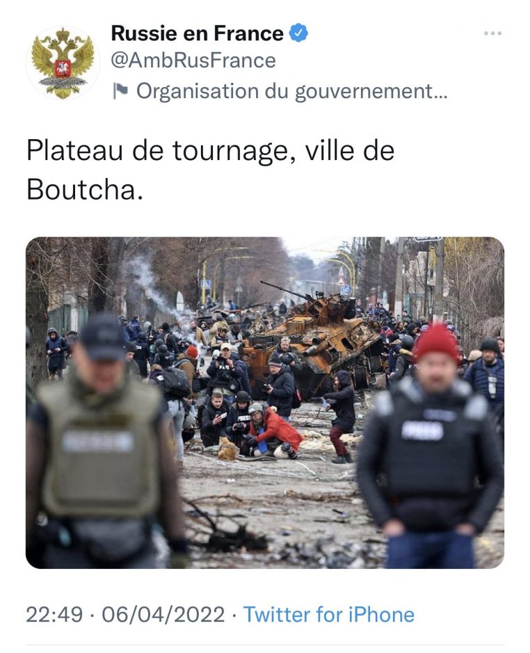 Et pour cause, ils ont diffusé des images de la ville martyre de Boutcha et ont accompagné cela de la légende suivante : « Ville de Boutcha, plateau de tournage ».