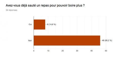 Toutes les études concernant l’alcoolorexie ont été réalisées aux États-Unis mais quid de la situation en France ? Si le phénomène s’étend Outre-Atlantique, il n’y a pas de raison qu’il s’arrête aux frontières de l’Europe. On remarque par exemple l’émergence des tendances comme le « binge-drinking » (boire beaucoup et très vite), bien implanté aujourd’hui dans l’Hexagone. Les résultats de notre étude montrent que 85,2% des sondés admettent avoir déjà sauté un repas avant une soirée au moins une fois au cours des six derniers mois. Les étudiants sortent en moyenne 2 fois par semaine et consomment en général deux ou plus de cinq verres d’alcool. La bière reste la boisson reine tandis que les alcools forts arrivent en dernière position, derrière le vin. Parmi les sondés, 28,7% pensent avoir une consommation d’alcool supérieure à la moyenne.