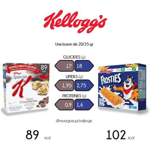 BOUM ! Là on rentre dans le dur. Parce que ces barres de céréales sont des petites bombes de sucre et n’apportent pas grand chose sur le plan nutritionnel. Là une fois de plus, on va avoir tendance à se tourner vers la marque qui nous donne l’impression d’être meilleure pour notre ligne. Or vous voyez bien que c’est sensiblement pareil. Là aussi, préférez du pain complet avec du beurre ou des purée d’oléagineux. Ou faites vous votre muesli maison. C’est tellement plus sain.