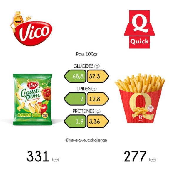 La chips de pommes ! Dites vous bien que Ok la chips de pomme c’est bon, mais ne vous leurrez pas. Cette petite chips croquante et sucrée n’est pas vraiment plus votre amie qu’une chips classique. D’ailleurs vous voyez bien le résultat quand elle est comparée à des frites… Le but n’est pas de vous dire ce que vous devez manger une fois de plus. Et manger ces produits de manière occasionnelle et raisonnable ne va pas vous tuer ni vous faire prendre 10 kilos. Mais gardez à l’esprit qu’un joli petit emballage vert sur lequel il est n’est pas forcément plus sain que d’autres.