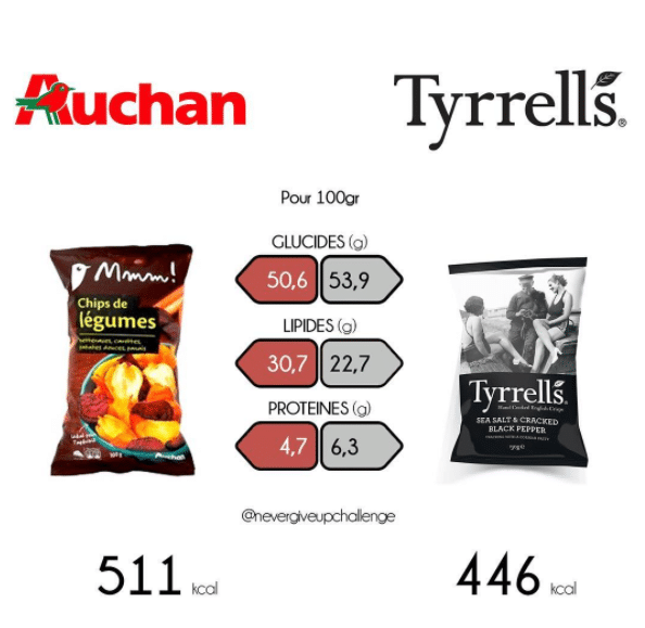 On reste dans ce registre, après la chips de pomme, celles de légumes. Là aussi, la démonstration est éloquente. On pense bien faire et au final, les deux produits se valent quasiment. Pensez bien regardez la composition de vos aliments. Si vous avez l’impression qu’il vous faut un diplôme en chimie pour comprendre la composition, c’est rarement bon signe… Le produit peut être peu calorique mais bourré de produits étranges. Une fois de plus, on en vous dit pas ce que vous devez manger. Voyez avec vous-même ce que vous souhaitez privilégier.