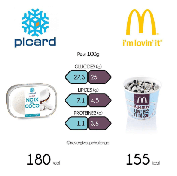 Là aussi, petite surprise au moment du dessert. On peut constater non sans un certain étonnement que ces deux produits sont finalement plus proches que l’on ne pourrait le croire, voire même que le moins diététique n’est pas celui qu’on pensait. On ne vous dit bien évidemment pas lequel vous devez choisir, libre à vous mais il est intéressant de constater à quel point notre jugement peut être biaisé par nos a priori et l’image du produit que nous renvoie le marketing autour de ces derniers.