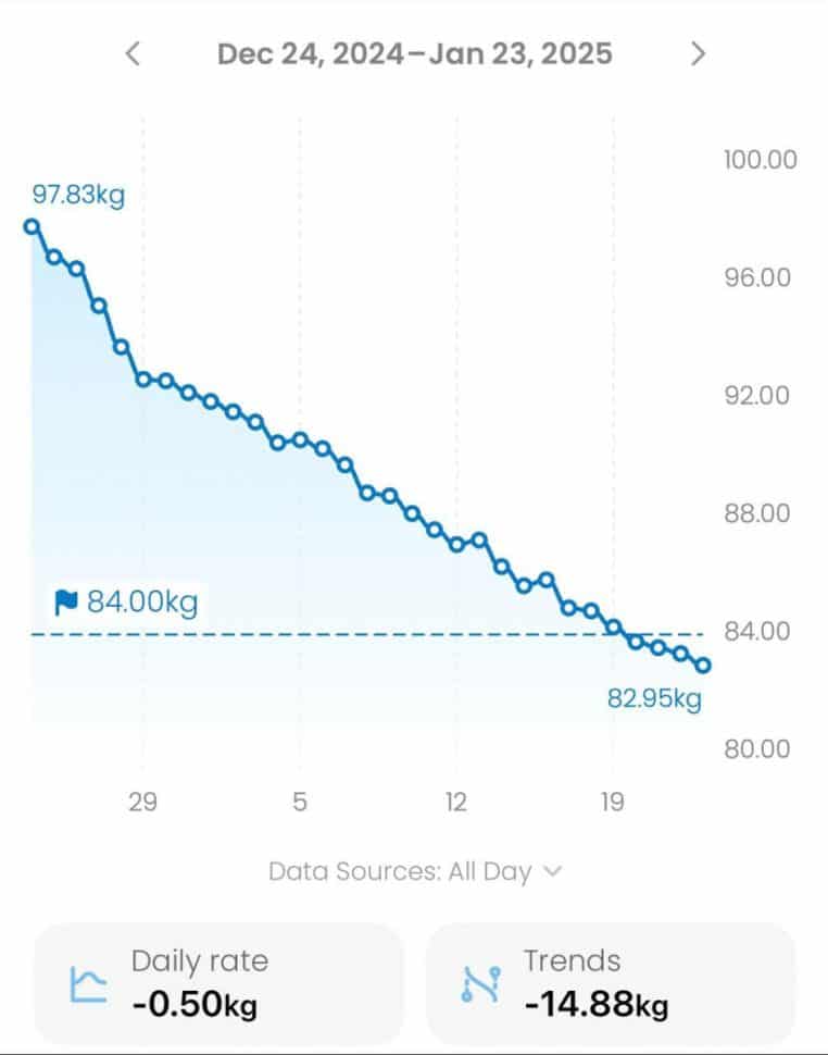 Le 24 décembre 2024, jour du début de son défi, ce jeune homme pesait 97,85 kg pour une taille de plus de 1m90. Après une semaine, lors de la St Sylvestre, il a perdu un peu moins de 6 kilos. Mais selon ses dires, ce n’était pas une tâche facile !