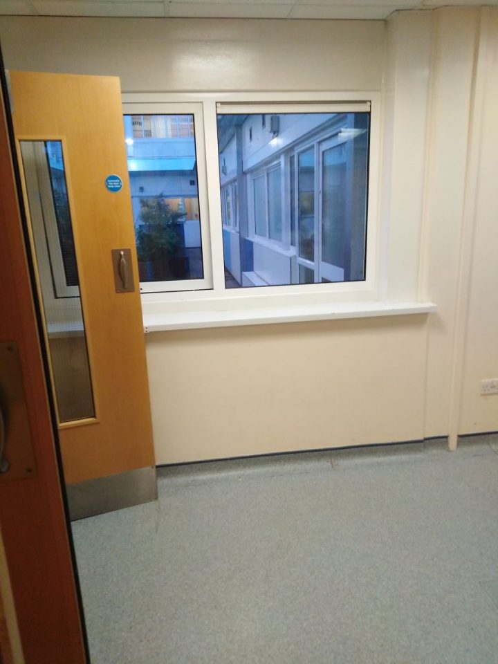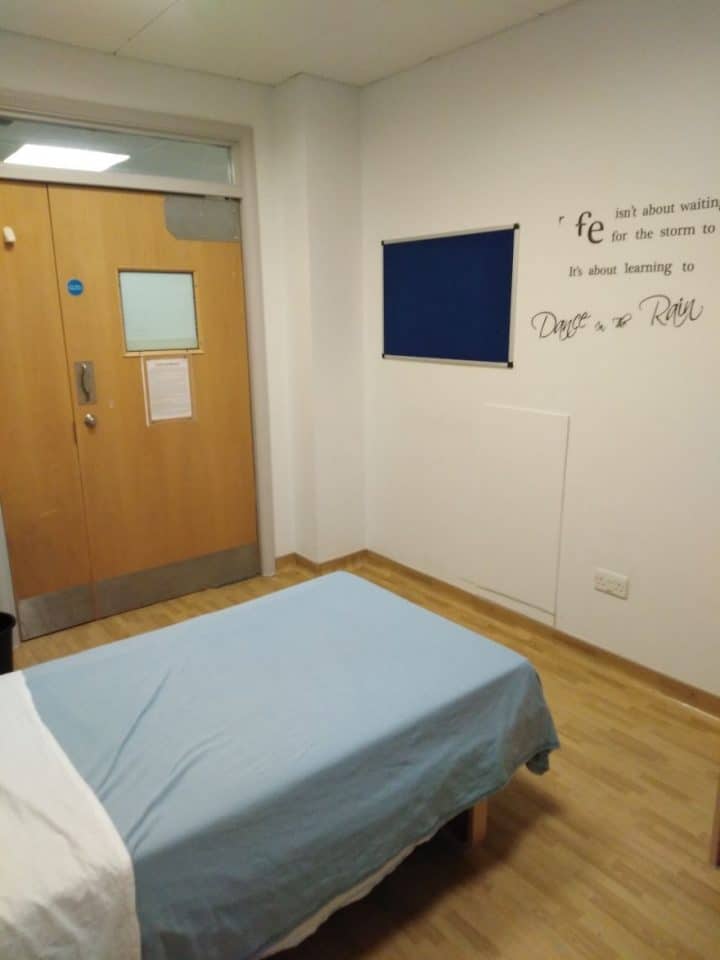 Voici la chambre que l’on m’a donnée. Je dois avouer que c’était assez confortable même s’il faisait trop chaud car je ne pouvais pas changer la température, ni ouvrir la fenêtre plus que quelques centimètres, pour des raisons de sécurité. Les prises de courant présentes dans la chambre ne sont pas utilisables par les patients puisque nous n’avons pas le droit aux câbles pour éviter tout risque de suicide. Il n’y a d’ailleurs aucun endroit auquel il est possible de s’attacher, même les toilettes n’ont pas de sièges ‘normaux’.