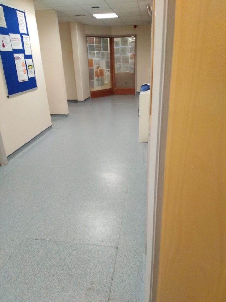 Voici un petit aperçu de ce que je pouvais voir en sortant de ma chambre. Le petit espace derrière la fenêtre auquel les patients peuvent accéder le jour sert à profiter de l’extérieur. À gauche de la photo il y avait le bureau des infirmières et juste après, la porte vers le monde extérieur. J’étais dans un compartiment fermé de l’hôpital alors même si quelqu’un essayait de sortir en douce il était obligatoirement repéré par un employé du staff médical.