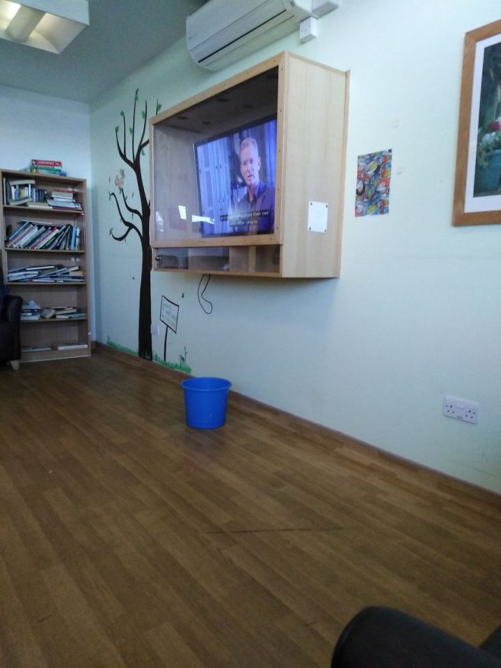 Ça c’est une toute petite partie de la salle de séjour. Elle est beaucoup plus grande que cela mais je ne voulais pas prendre en photo les autres patients, tout d’abord car c’est illégal et surtout parce qu’ils ont droit à leur vie privée. Dans cette salle on pouvait venir regarder la télévision. Elle était totalement encastrée dans une boîte en bois que je trouvais assez mignonne. Comme ils ont perdu la télécommande, la seule façon de changer de chaîne était de trouver quelqu’un avec des bras aussi fins qu’une feuille de papier.