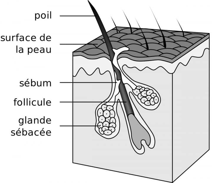 C’est le moment d’employer des termes techniques, en commençant par expliquer le cheminement hormonal qui conduit à un bouton d’acné. Il faut savoir qu’il apparait lors de la conjonction de trois évènements qui sont : une sécrétion excessive de sébum dans le follicule (le follicule pileux est la racine de nos poils, sa base possède des glandes sébacées, qui sont responsables de la production de sébum et de matières grasses empêchant ainsi le dessèchement de la peau), ensuite, une obstruction du follicule, et enfin, un développement bactérien à l’intérieur du follicule.