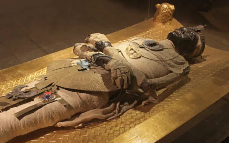Cette momie, c’est Amenhotep Ier, deuxième roi de la 18e dynastie, qui a régné entre 1525 et 1504 avant Jésus-Christ. Le fils cadet d’Ahmôsis Iᵉʳ et d’Ahmès-Néfertary a été exhumé en 1881 à Louxor, en Egypte. Il représente la seule momie dont les bandelettes, enroulées sur le corps du défunt, n’ont jamais été déroulées par les chercheurs, afin de préserver au mieux l’aspect de celle-ci. Le cadavre était conservé au Musée du Caire.