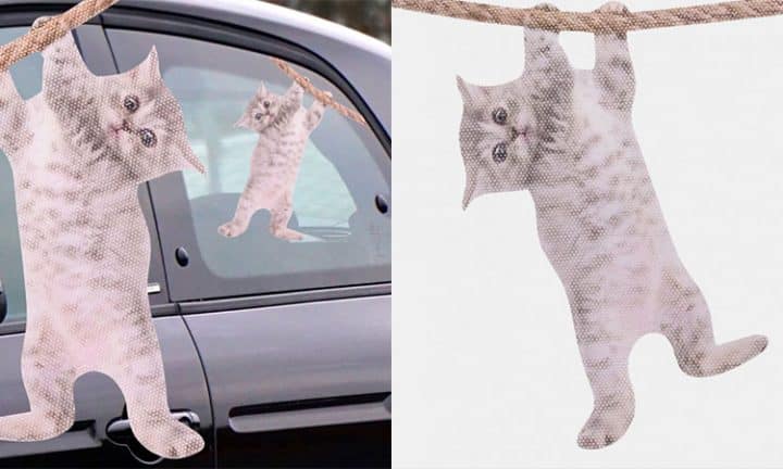 Les stickers, c’est toujours marrant à coller sur une voiture. Il en existe des beaucoup plus mignons, comme ce chat agrippé à une corde.