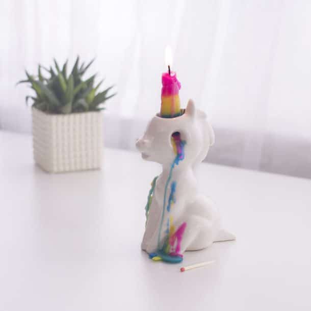 Vous l’avez peut-être remarqué, 2016 était l’année de la licorne. Mais vraiment. La tendance licorne s’est d’abord invitée dans nos maisons, puis dans nos placards, et finalement, dans nos assiettes. Entre les objets licorne en tout genre, les chaussons licorne, ou encore les macarons licorne, on en a vu de toutes les couleurs. Et c’est le cas de le dire. Alors aujourd’hui, messieurs dames, préparez-vous à découvrir un objet pour le moins insolite. En effet, il s’agit d’une bougie licorne. Mais pas n’importe quelle bougie. Ahah !