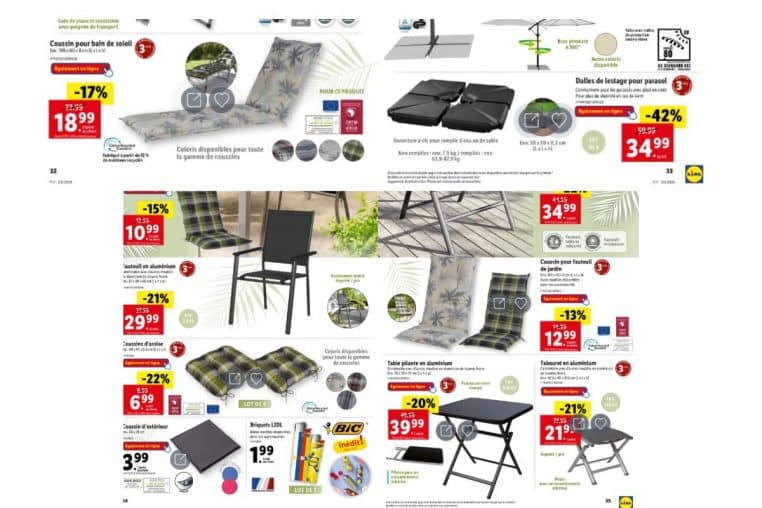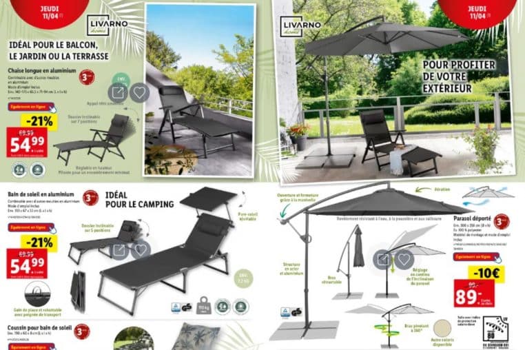 Allant de 13 % de réduction à – 42 % de promotion, les produits pour le beau temps de Lidl sont nombreux. Il y a notamment un pied pour le parasol, plusieurs styles de cousins pour le sol ou pour les bancs, des tables de jardin et tables de camping… Il y en a pour tout le monde.