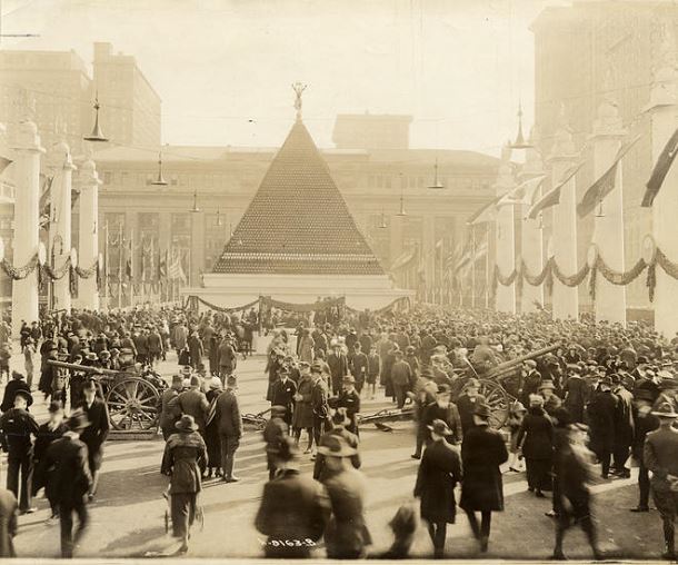 En 1918, à la fin de la première guerre mondiale, une pyramide a été érigée avec des casques de soldats allemands retrouvés après les bataille. Cette pyramide était exposée à la gare de Grand Central Terminal à New-York.